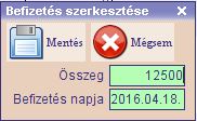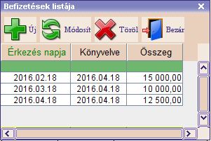 Fizetve: Ha egy számlát kiegyenlítettek, akkor ezzel a gombbal könyvelni is tudjuk azt. "Mai nappal érkeztetem" gombbal az aktuális nap dátumával a számla végösszegével egyenértékű befizetést regisztrál a program. "Más nappal érkeztetem" gombbal egy tetszőlegesen megadható dátummal regisztrálja a program a számla befizetését. "Részösszeget érkeztetek" gombra megjelenő űrlap segítségével részösszeget könyvelhetünk el egy megadott dátumra. "Részösszegek kezelése" gombra kattintva az eddigi a számlához tartozó összes befizetést egyszerre láthatjuk, illetve azokat módosíthatjuk, törölhetjük, azaz tetszőlegesen szerkeszthetjük az "Új", "Módosít", "Töröl" gombokkal.