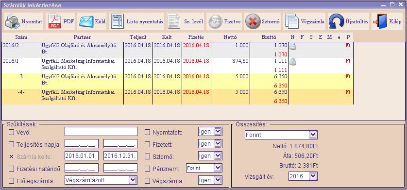A végszámla máris menthető, nyomtatható. Az efféle dokumentumok nyomtatáskor a Végszámla címsort kapják.